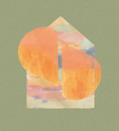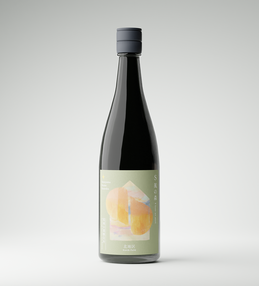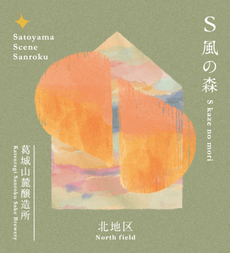 S 風の森のラベルでは、山麓蔵からの景色や風景(Scene)を切り取り表現。山麓蔵と里山の夕暮れの風景をイメージしたデザインとなっています。 農作業やお酒造りなど山麓蔵を取り巻く一日が終わり、だんだんと夜が近づく空が表現されています。