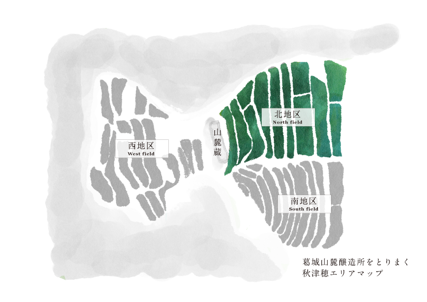 山麓蔵の目の前に広がる棚田の地区。 山麓蔵周辺の栽培地区3か所のうち、田んぼ一枚あたりの広さが平均して大きめで、非常に美しい景観の棚田が続くエリアです。 日当たりも良好で、他の地区と比較すると生産性は高めとなっています。 しかし、この地区も標高が高く、灌漑用水が入らないため、山から流れる清らかな天然の山水で秋津穂が栽培されています。 長年、地域の農家の方々が農業を担っておられますが、高齢化や後継ぎ不足の問題によってその持続性が問題となっています。 今後、ご協力いただける地域のパートナー農家さんに、徐々に秋津穂の栽培に切り替えていただき、共に減農薬栽培に取り組んでいく地域となっています。 2023年より減農薬栽培に切り替えていただいた田んぼでの土壌分析結果では、土1gあたりに生息する微生物数の経年での増加がみられています。 環境負荷の少ない農法によって微生物の多様性が回復しつつあり、その土地の個性が栽培される秋津穂へ引き出されています。 この土地で栽培される秋津穂で造られるS風の森には力強い大地のエネルギーが宿り、豊かな複雑味が特徴となっています。