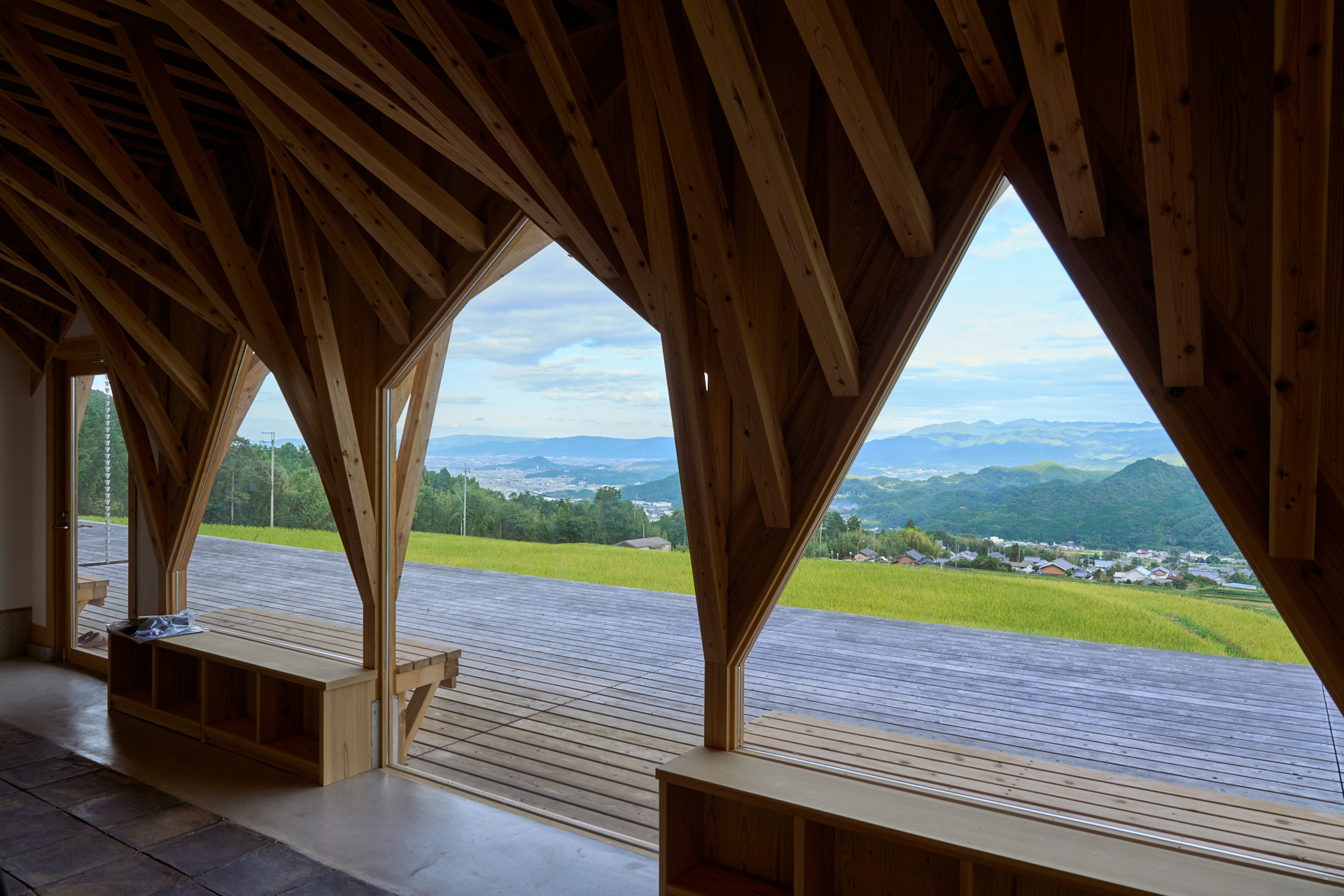「棚田と呼応する建物の形状とし、稲穂のリズムと合わせたランダムな開口部から、棚田に吹く風が抜ける建物にしました」